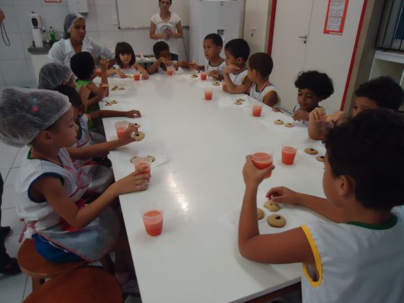 Além do preparo dos cookies, as crianças participaram de um jogo, chamado ‘Jogo da trilha’. Nesse jogo, as crianças foram divididas em dois grupos, os quais deviam disputar entre si, quem chegava primeiro ao final da trilha. Cada grupo passava, assim, por figuras de alimentos sem gordura trans ou por alimentos considerados perigosos à saúde, ou seja, contendo gorduras trans e ricos em açúcares, conforme número indicado por um dado jogado pelas próprias crianças. Após o jogo, as crianças degustaram os cookies, demonstrando boa aceitação, pelo fato de muitas repetirem a preparação.